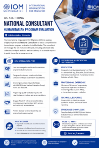 IOM is seeking a highly experienced National Consultant to lead a humanitarian program evaluation in Addis Ababa. The successful candidate will be responsible for directing all phases of the evaluation lifecycle, including advanced data collection, in-depth analysis, and the delivery of actionable reports to guide humanitarian programming.